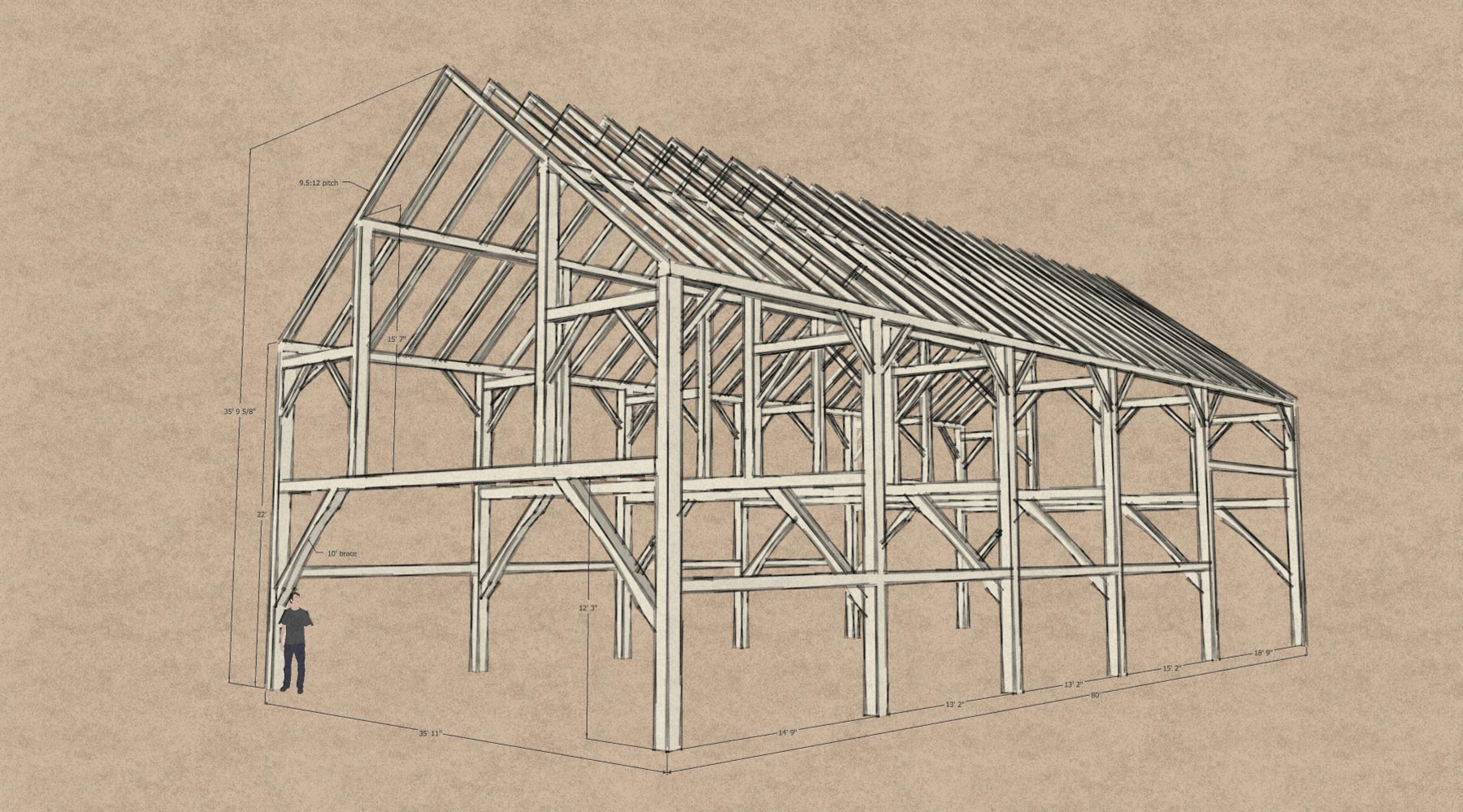 This barn, originally from Cooperstown NY, had been built on a dairy farm to preserve massive amounts of hay throughout the winter months. When we restored the frame, we removed the center posts and added large braces to support the beautiful, sawn connecting ties, giving the barn a clear span of 36’. Now retired from supporting many tons of hay, the restored frame provides that grand space for dozens of weddings every year.