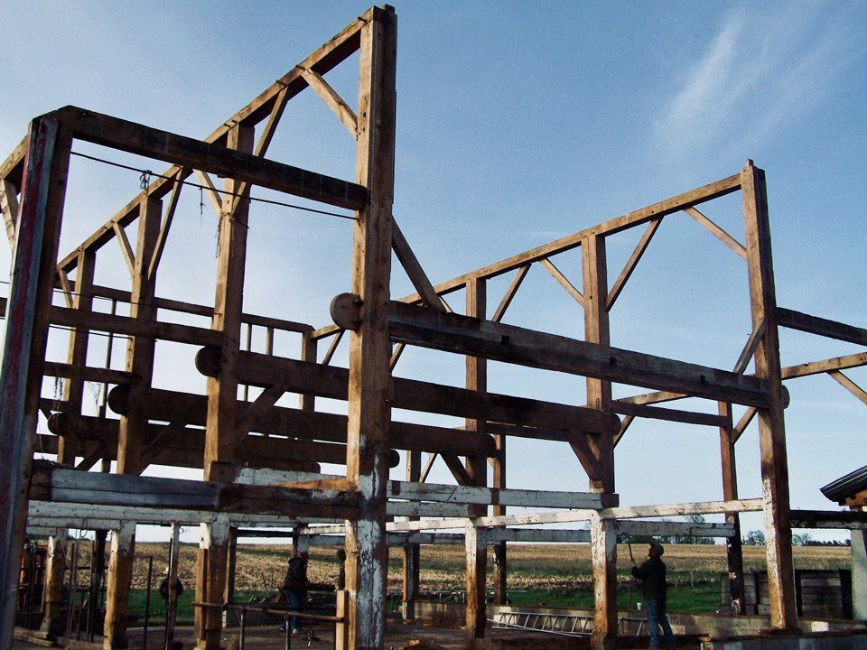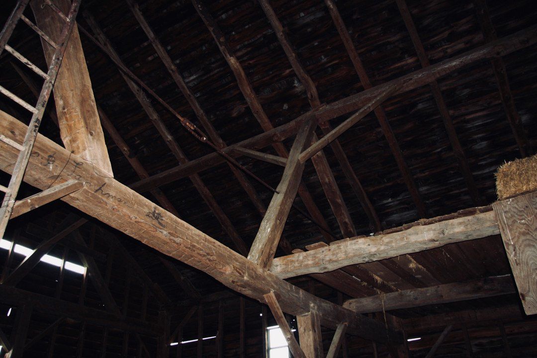 This particular Dutch Barn came from the Mohawk Valley, west of Albany in the Village of Mariaville. Built in 1776, this is an excellent example of New World Dutch Barn construction with its massive virgin timbers. None of the beams were cut on a saw mill and you can see its original Roman numeral “marriage marks” on the beams. These were marked by the original builder to show him the place of each beam in the finished building. This was the pre-industrial age before barns were built for specialized uses, like the large dairy barns of today. This means that they had many diverse uses like storing hay and grain in sheaves and housing livestock like cattle, oxen, horses, chickens, sheep and goats. Wagons and carriage were also stored in the barn along with harness and all the horse-drawn farming equipment like ploughs and harrows. It was also used for threshing grain, a process in which the kernels of grain were separated from the stalks and chaff by the processes of flailing and winnowing. These were working buildings that farm families’ lives depended on.